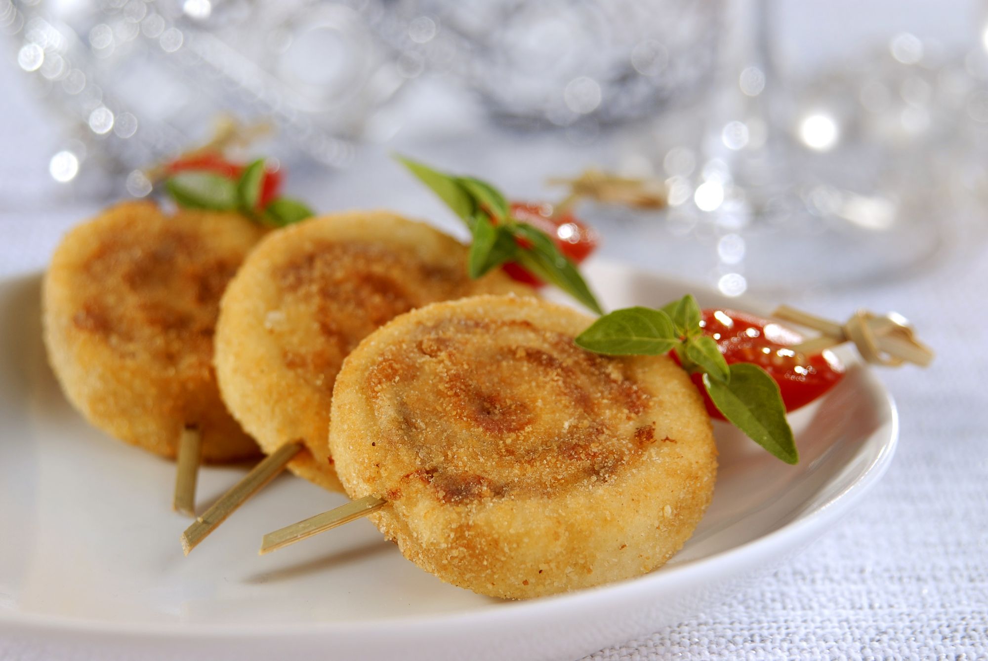 Para formar os canapés, corte cada rolinho em cinco fatias. Passe-os em clara de ovo e empane na farinha de rosca.