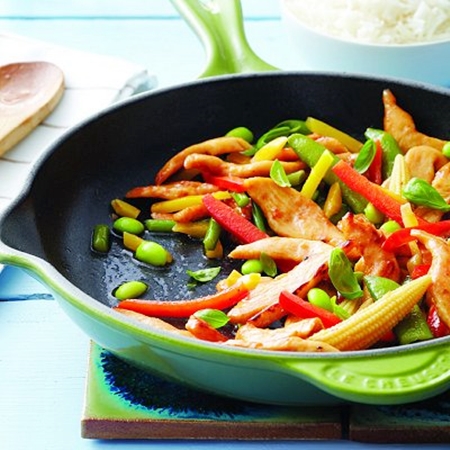 Junte a ervilha, o salsão e refogue mais um pouco, mexendo até que os legumes fiquem cozidos e crocantes. Coloque um pouquinho de água, se necessário. Sirva