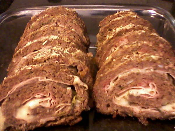 Abra em cima de um plástico untado, alisando bem (fica parecendo um quadrado ou retângulo de carne) e quando chegar no tamanho desejado, coloque o presunto por baixo e a muzzarela por cima. Enrole como um rocambole firme e retire o plástico com cuidado para não desmontar o rocambole, se preciso arrume as laterais para ficar bem fechadinho.