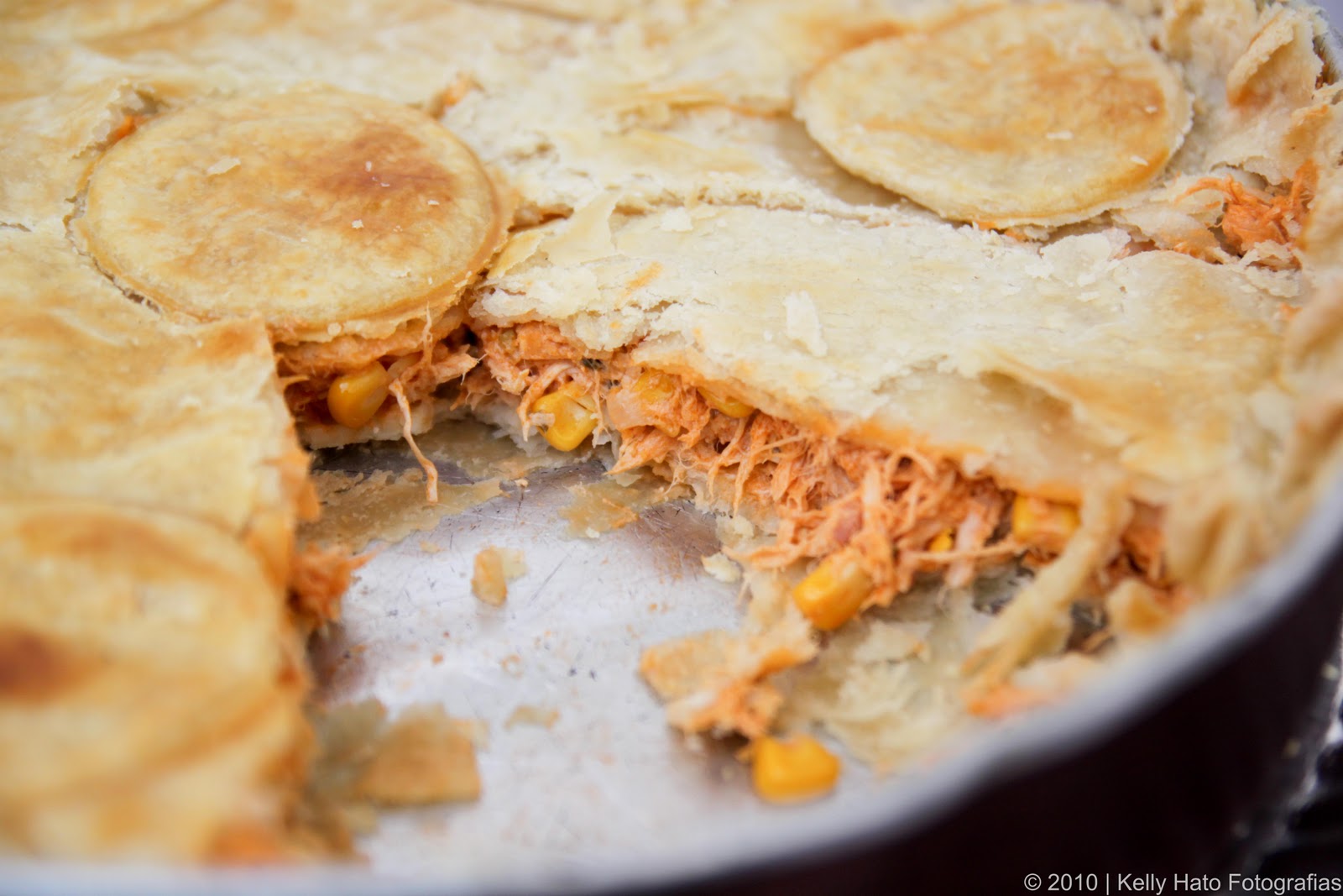 Refougue a cebola e o alho no azeite , quando estiver murcho coloque o frango desfiado, azeitonas,tomate picado, leite com amido de milho, molho de tomate a gosto, milho verde, salsa a gosto e deixe esfriar