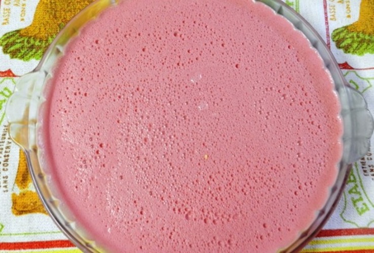 Depois de colocar a gelatina na água fervendo adicione o suco de framboesa só um sachê.