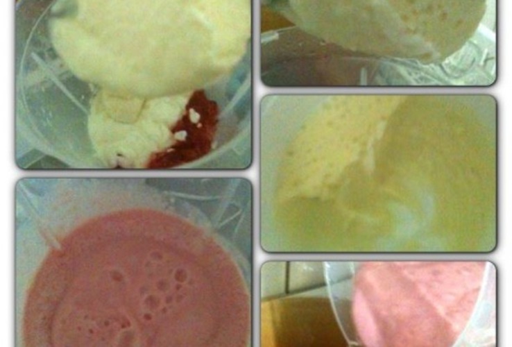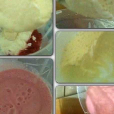 Na foto, depois de gelado, eu bati ele com uma receita pronta e endurecida de gelatina de morango.. Ficou parecendo danoninho!