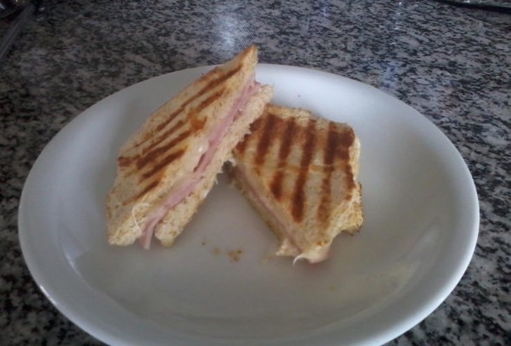 Retire do micro-ondas, desenforme, divida ao meio e coloque recheio de sua preferência. Leve o panini para dourar no tostex ou grill.