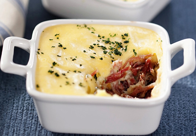 Em um refratário untado com azeite coloque uma camada do purê de mandioca, a carne seca e termine com o restante do purê.