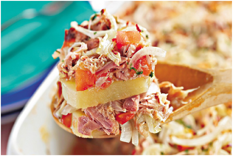 2. Alterne camadas de batata, tomate, cebola, atum e mussarela.
