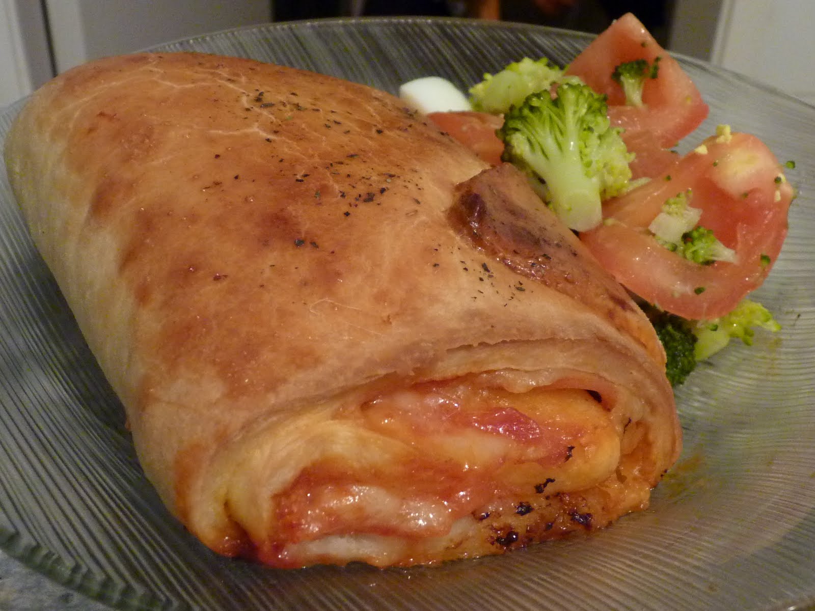 Depois abra a massa e recheio com uma fatia de queijo e outra de presunto