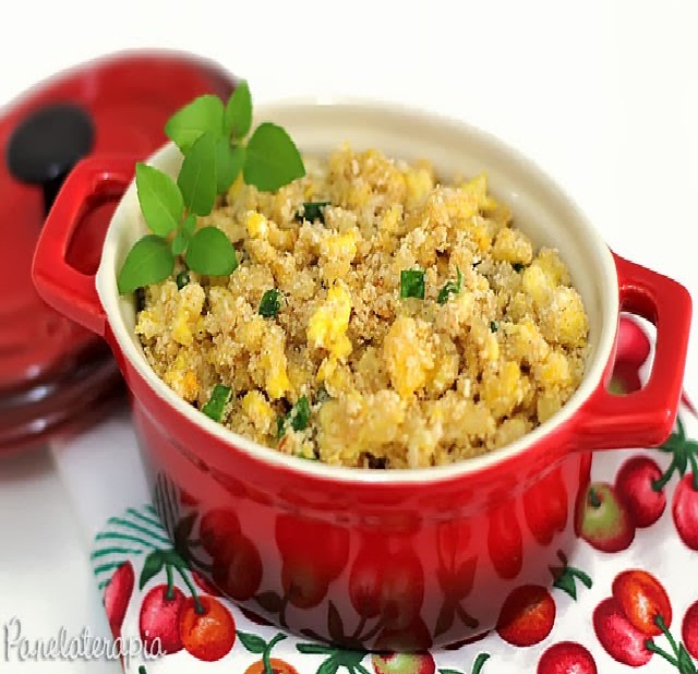 Refogue 1/2 cebola grande picada (ou 1 pequena) em 2 colheres (sopa) de azeite e 1 colher (sopa) de manteiga. Mantenha em fogo baixo para a cebola fritar lentamente. Adicione 2 ovos e misture bem, como se estivesse fazendo ovos mexidos mesmo. Acrescente 4 colheres (sopa) de farofa pronta e cebolinha verde à gosto. Tempere com sal e pimenta.