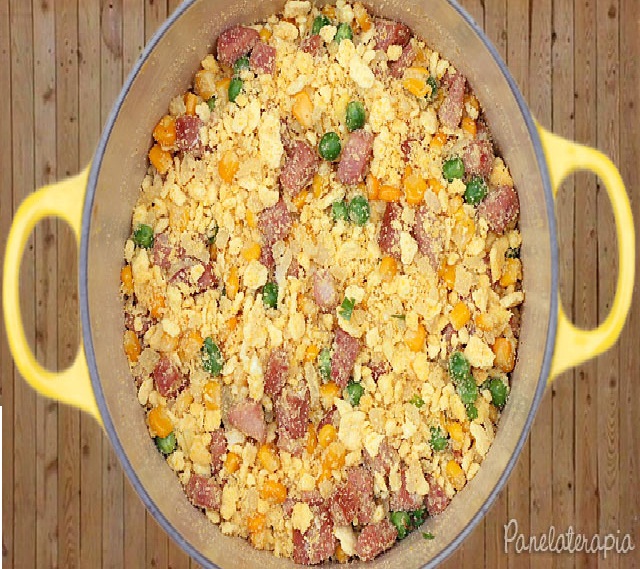 Refoguei 1/2 gomo de calabresa com 1/2 cebola picada em um pouco de azeite, juntei 1/2 lata de milho e um punhado de ervilhas frescas (daquelas congeladas). Na sequência quebrei um ovo e misturei bem. Temperei com pimenta, sal e cheiro verde. Juntei farofa pronta.