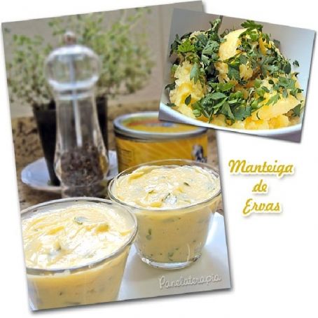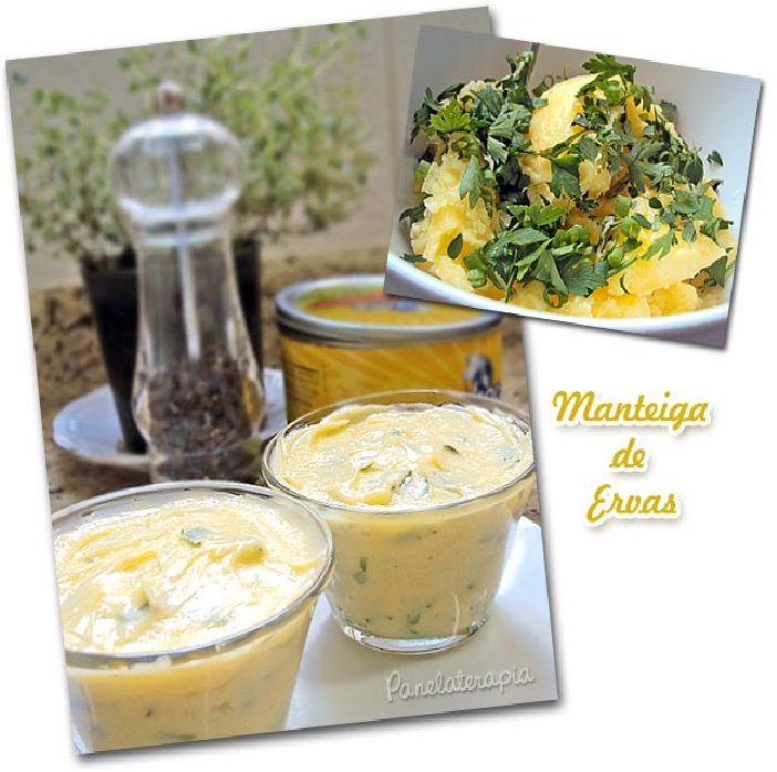 Basta misturar 250g de manteiga amolecida em temperatura ambiente com 1 dente de alho grande amassado ou triturado e as ervas da sua preferência (usei manjericão, tomilho, salsinha e cebolinha). Tempere com um pouco de pimenta do reino e se tiver usado manteiga sem sal, coloque uma pitadinha.