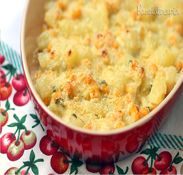 Refogue a cebola e o alho na manteiga e no azeite. Junte a batata, o milho e o cheiro verde. Adicione o caldo de legumes e um pouquinho de água (2 colheres de sopa) para dissolvê-lo. Misture bem. Acrescente o creme de leite e o creme de ricota. Acerte o sal se achar necessário. Salpique parmesão e leve ao forno para gratinar.