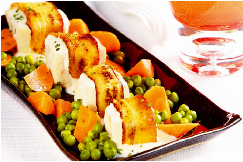 Coloque numa panela a água e o tempero para peixe. Misture bem, acrescente os cubos de peixe e leve ao fogo até que esteja cozido. Reserve. Leve ao fogo o leite, a maisena e o sal, mexendo até que engrosse. Retire do fogo, misture o creme de leite e reserve. Corte as bananas em fatias no sentido do comprimento. Aqueça a margarina em uma frigideira antiaderente e doure a banana. Num refratário, acomode os cubos de peixe, cubra com o creme e a banana. Sirva a seguir.