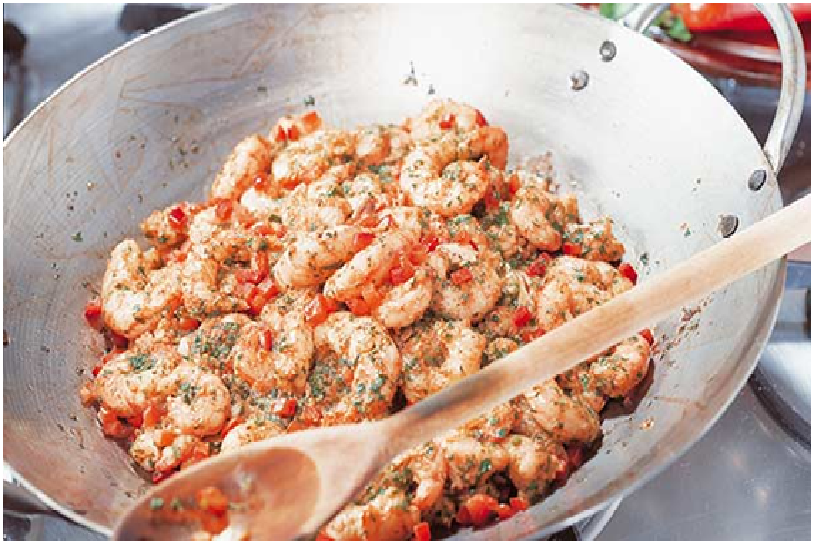 Misture o suco de limão, a água, a pimenta e o sal. Deixe o camarão de molho no tempero por 15 minutos. Depois, escorra-o e reserve o caldo. Espalhe a farinha em um prato e passe os camarões nela. Leve uma panela wok ao fogo alto com a manteiga e o azeite. Frite metade dos camarões, mexendo com uma colher de pau por um minuto. Retire-os com uma escumadeira e reserve. Frite os camarões restantes e reserve-os junto com os demais. Coloque na panela o caldo reservado, adicione o colorau e deixe ferver por um minuto. Acrescente os camarões e aqueça até começar a ferver, mexendo sempre. Ponha a salsa, o coentro e o pimentão. Misture e sirva em seguida.