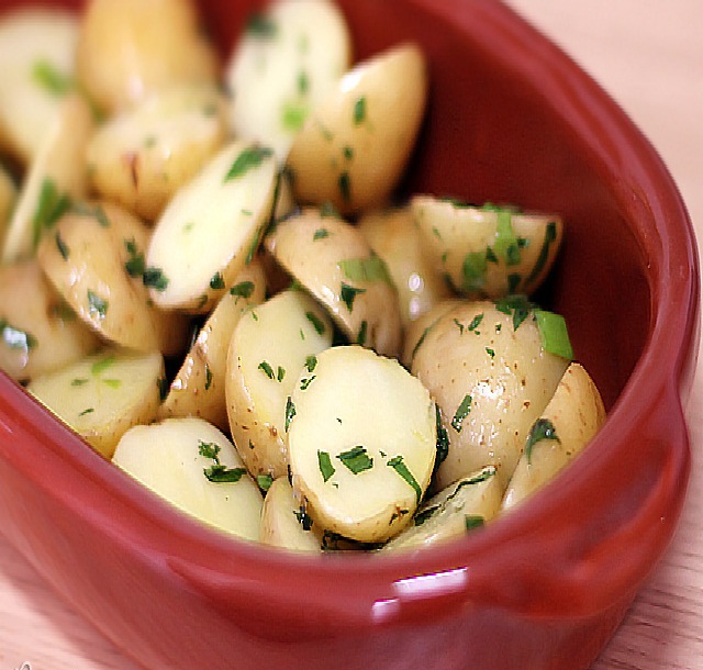 Corto as batatinhas ao meio e cozinho e água e sal (não pode cozinhar demais). Pode deixar com a casca, é só lavar direitinho.