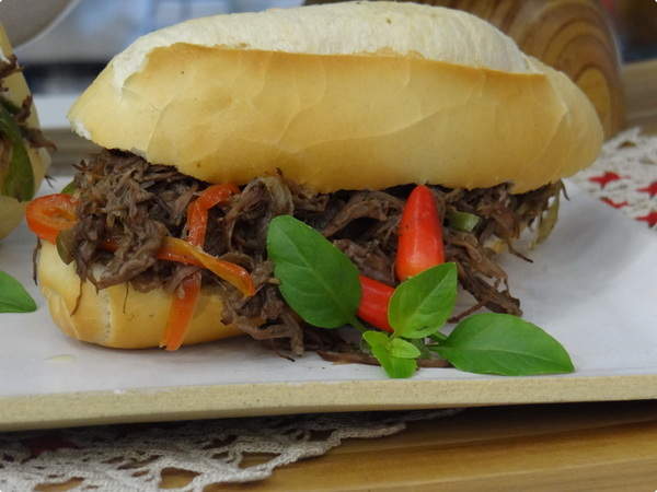 2° - Depois deste tempo, desligue o fogo, retire a pressão, abra a panela e coloque 1 xícara (chá) de cebola fatiada finamente, ½ xícara (chá) de pimentão verde fatiado finamente e ½ xícara (chá) de pimentão vermelho fatiado finamente. Volte ao fogo baixo e com uma colher de pau vá mexendo até a carne ficar totalmente desfiada e os temperos incorporados. Salpique salsinha picada a gosto e sirva em seguida com pão francês.