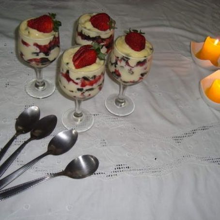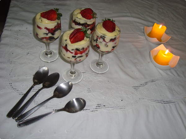 4° Escolha um pirex ou taças, (assim como as que eu fiz. Rendeu 04 taças bem generosas...). Intercale as camadas: creme, biscoito, creme, morango, creme. Até acabar os ingredientes, sendo que a última camada deve ser de creme. Termine enfeitando com um morango. Leve para gelar um pouquinho, mas não muito para não endurecer! Pronto!!! Fica uma delícia!!!
