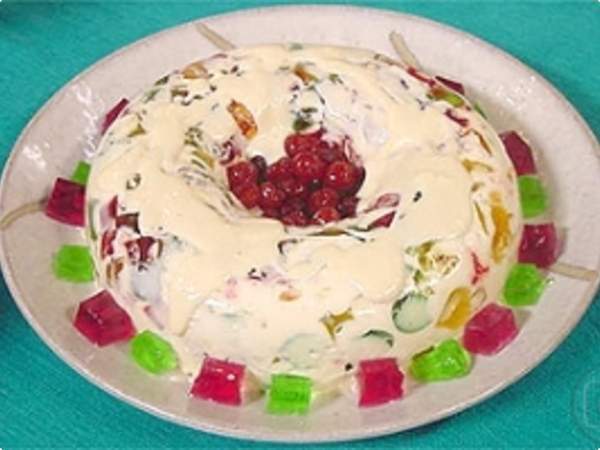 Coloque a gelatina em taças ou em fôrmas com furo no meio. Despeje o creme e leve para gelar.