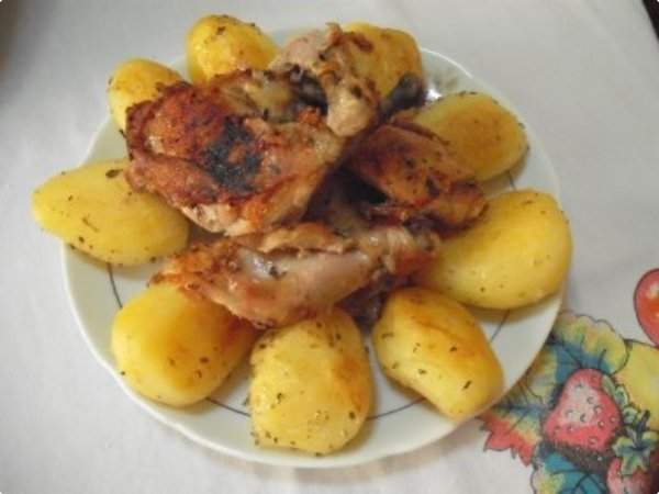 Depois de bem limpas e lavadaas as coxas e sobrecoxas, junto com as batattascoloca-se o suco de limão, tempera-se com o sal a gosto, o alho amassado, e oregano.