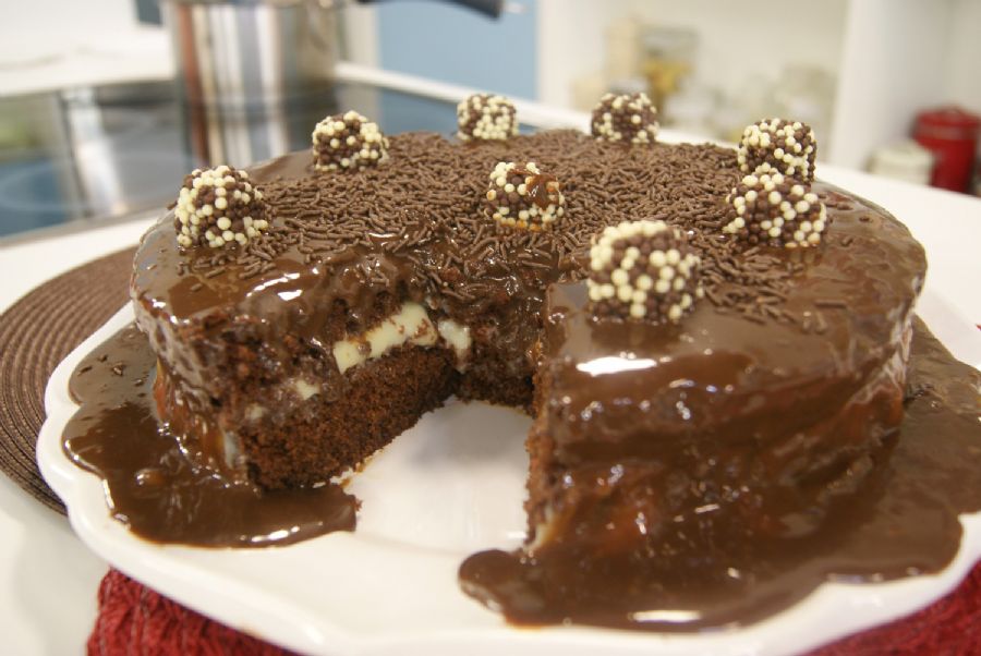 Corte o bolo ao meio, e regue com o licor de chocolate, em seguida recheie com o brigadeiro branco, cubra com a outra metade da massa do bolo, e cubra com o brigadeiro ao leite, salpique o chocolate granulado e sirva.