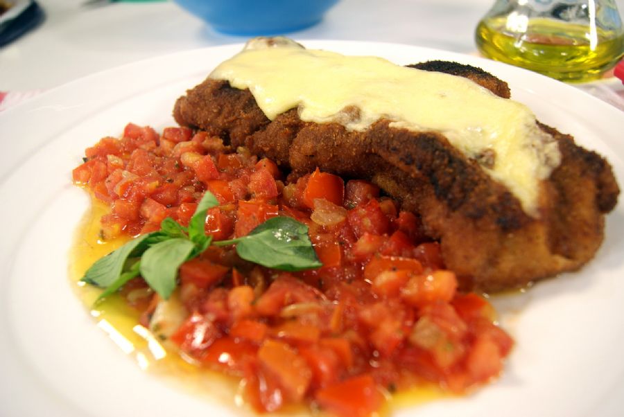 Coloque o molho em uma travessa, disponha os bifes empanados sobre ele, cubra com as fatias de mussarela e leve ao forno quente até derreter e aquecer.