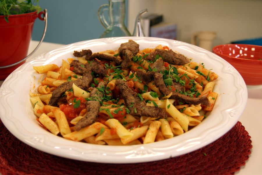 Para o molho, aqueça o azeite e doure o alho. Coloque os tomates e cozinhe por aproximadamente 10 minutos em fogo médio, coloque o restante dos ingredientes misture e adicione o penne cozido. Transfira para um refratário e disponha as tiras de carne sobre a massa e sirva.