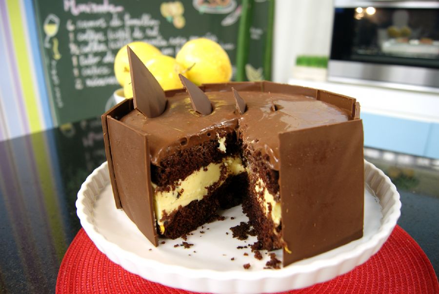 Para decoração, derreta o chocolate e espalhe sobre uma folha de papel manteiga. Leve para geladeira por pouco tempo para não ficar quebradiça. Retire da geladeira, corte a placa de chocolate no formato desejado e reserve até o momento de decorar o bolo. Desenforme o bolo, retire o acetato e decore com as placas de chocolate.