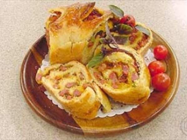 3 - Em cada massa espalhe por igual a linguila, cubra com mussarela e enrole como um rocambole, começando por uma das pontas. Junte uma massa na outra como uma trança, faça uma rosca, juntando a ponta.