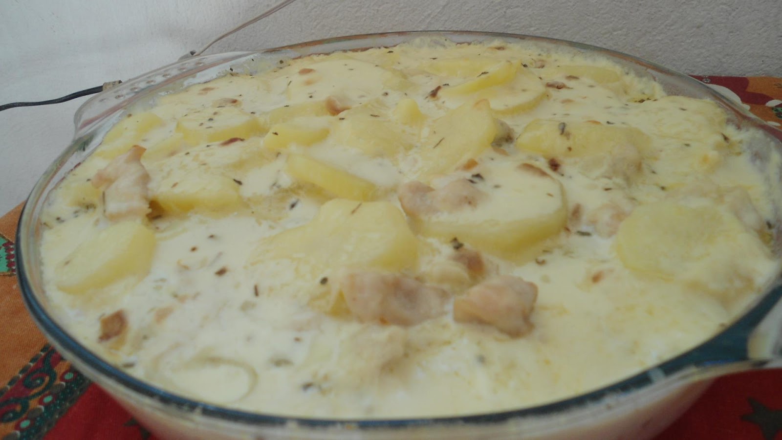 Alterne camadas de batatas, cebolas, mussarela e frango