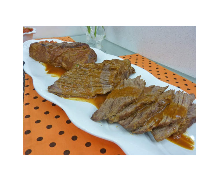 2°- À parte, em uma tigela, coloque ½ lata de molho de tomate, 1 pacote de sopa de cebola e 350 ml de cerveja preta e misture. Coloque esta mistura na maminha, tampe a panela e, após pegar pressão, conte 1 hora. Desligue o fogo e retire a pressão.