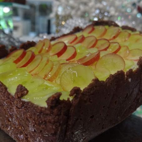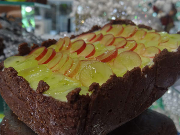 5°- Coloque este creme de chocolate branco na caixa de chocolate (forrada acima) e leve a geladeira por 20 minutos. Retire da geladeira e decore com uvas verdes e roxas sem sementes, fatiadas no sentido do comprimento. Sirva em seguida.