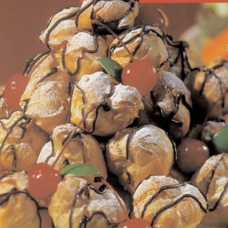 Coloque o creme de limão em um saco de confeitar e recheie as carolinas, furando-as na base com o bico. Em um prato de servir, faça um circulo de carolinas e preencha com algumas delas. Monte uma segunda camada de diâmetro menor e repita o processo até a última camada, terminando com uma carolina. Polvilhe com o açúcar de confeiteiro e com uma garfo , espalhe o chocolate derretido em fios sobre as carolinas. Decoe com cerejas e folhinhas feitas com casca de limão. Sirva gelado.