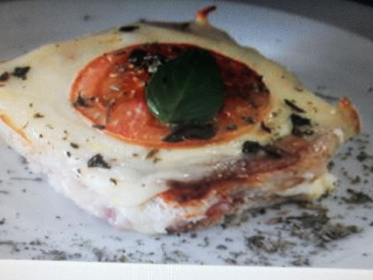 Colocar metade do molho de tomate temperado, presunto, camada de requeijão, metade da mussarela, restante do pão de forma, molho de tomate, creme de leite, mussarela, tomate em rodelas, orégano