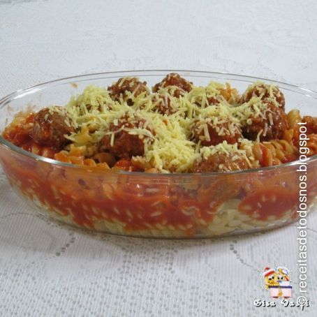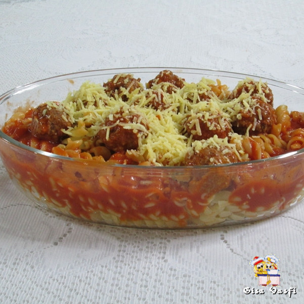 Coloque parte do molho de tomate em um pirex, coloque a massa escolhida e cubra com as almôndegas e o molho restante.