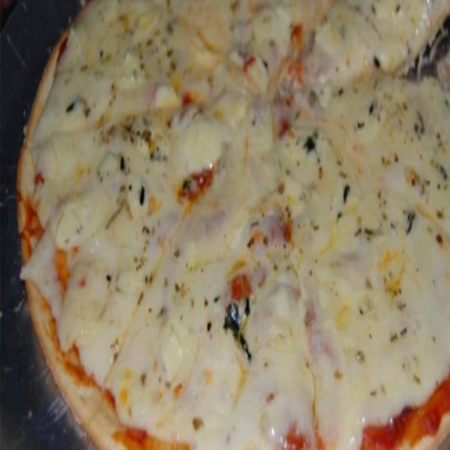 Bacon à moda: molho, muçarela, presunto, bacon, cebola, pimentão picado, ervilha, milho e orégano.
