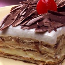 Montagem:Coloque em um refratário grande na seguinte sequência: creme branco, metade das bolachas, creme de chocolate, restante das bolachas, claras em neve