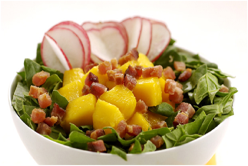 Espalhe o espinafre num recipiente. Por cima coloque a manga e o rabanete. Frite o bacon até que fique crocante. Salpique-o sobre a salada.