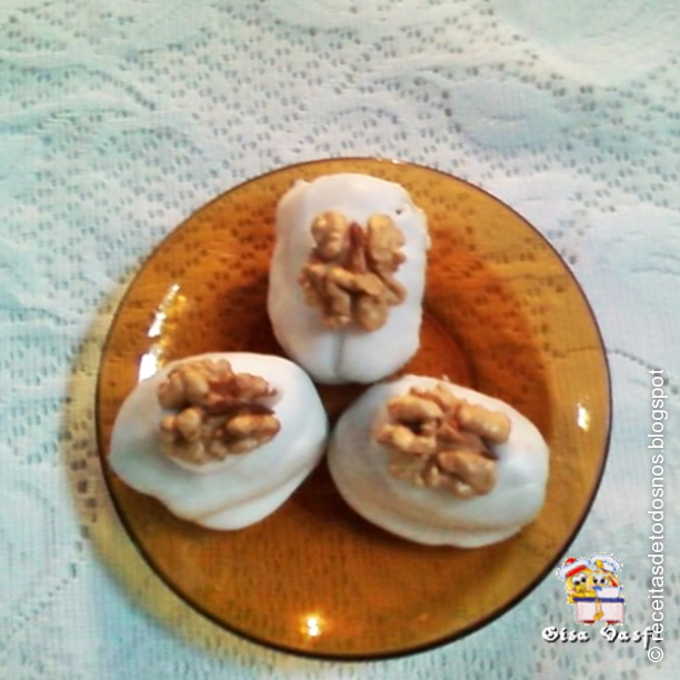 Deixe esfriar, modele pequenos croquetes, banhe no fondant e coloque uma metade de noz.