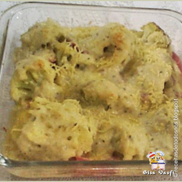 Encaixe os rolinhos de frios entre os buquês de couve-flor, cubra com o molho branco restante, polvilhe com queijo ralado e leve ao forno por 40' ou 50'.