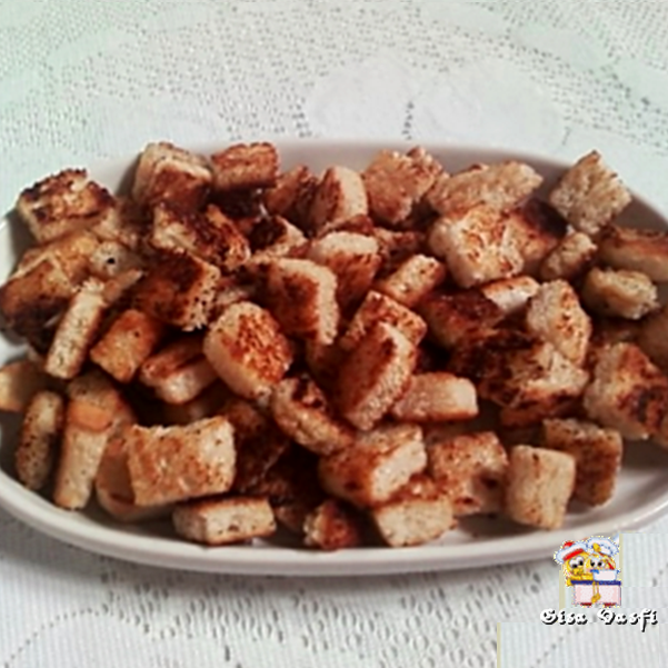 Se quiser incrementar, misture a manteiga com um ou mais dos temperos sugeridos e passe nos dois lados das fatias de pão e, a seguir corte em cubinhos.