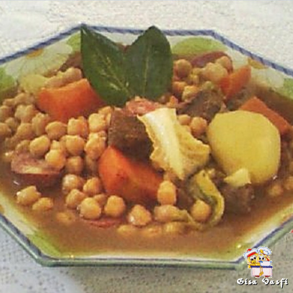 Cozinhe o grão de bico com a linguiça cortada em rodelas e as folhas de louro.
