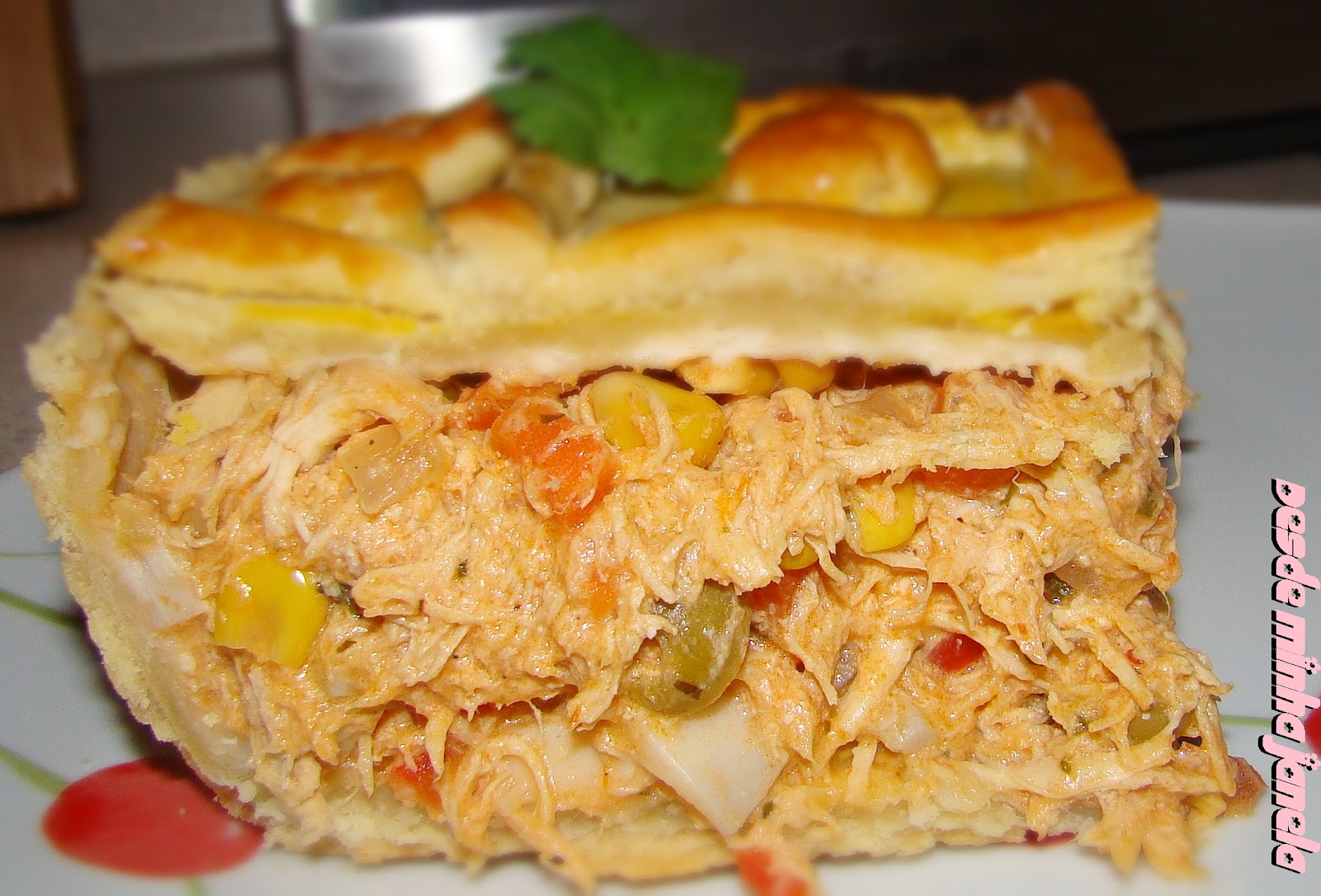 Abra a outra metade da massa com um rolo sobre um pedaço de filme plástico e disponha por cima do recheio, fechando o empadão nas laterais