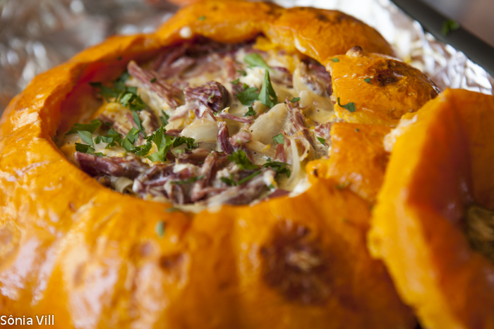 Deixar a carne seca de molho de um dia para o outro para retirar bem o sal (não esqueça de trocar a água). Dar uma fervura rápida na carne e deitar a água fora. Cortar a carne em pedaços pequenos e colocar na panela de pressão com a água deixando cozinhar por uns 15 minutos (também podem utilizar panela normal. Demora um pouco mais, mas fica igual). Escorra a água e reserve. Numa frigideira, colocar azeite, dourar a cebola e o alho. Juntar a carne, salsa, o leite de coco e refogar por 15 minutos. Reserve. Entretanto a abóbora foi sendo preparada. Leva mais ou menos 1 hora no forno, por isso podem ir preparando com antecedência. Escolham uma abóbora redondinha e bonita. Abrir uma tampa e retirar as sementes. Untar o interior com um pouco de azeite e polvilhar com sal.Colocar o refogado da carne dentro. Embrulhar em papel de alumínio e levar ao forno pré aquecido (± 200°) até que fique macia ao toque. Convém colocar a abóbora num recipiente que depois possa levar à mesa.