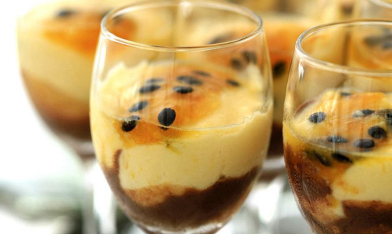 Numa panela, coloque 2 latas de leite condensado, o chocolate em pó e o amido de milho dissolvido no leite. Leve ao fogo baixo, mexendo sempre, até engrossar. Deixe esfriar. Enquanto isso, bata no liquidificador o restante do leite condensado, o suco de maracujá e o creme de leite. Coloque o creme de chocolate num refratário e, por cima, o creme de maracujá. Leve à geladeira por, no mínimo, 4 horas antes de servir.