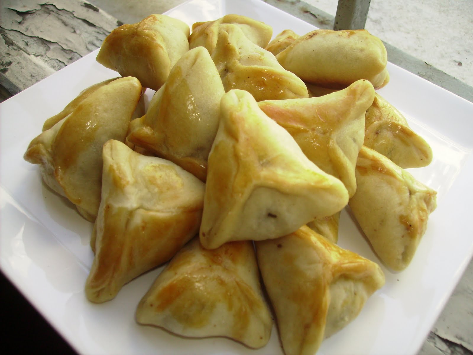 Com o auxílio de um rolo, abra as porções e espalhe as porções do recheio (já frio) e feche, unindo as pontas em formato triangular.
