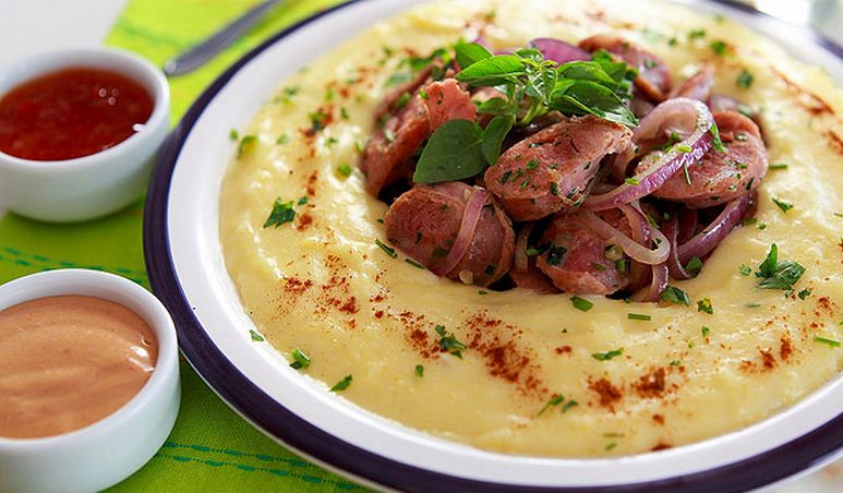 Distribua esse molho de calabresa por cima do purê e sirva a seguir.