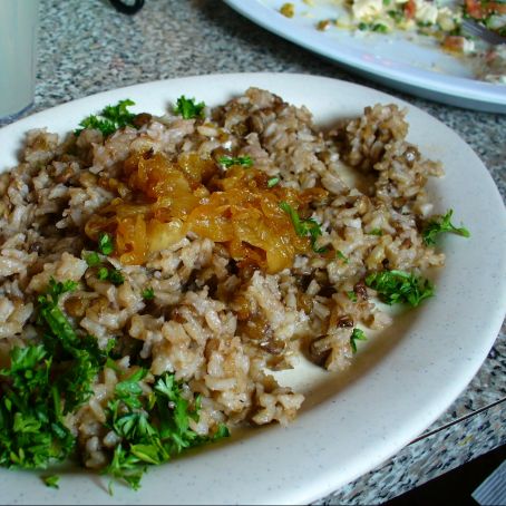 Volte as lentilhas para a panela e acrescente o líquido reservado, 2/3 das cebolas refogadas, sal, pimenta-do-reino branca, canela em pó, noz-moscada e o arroz lavado.