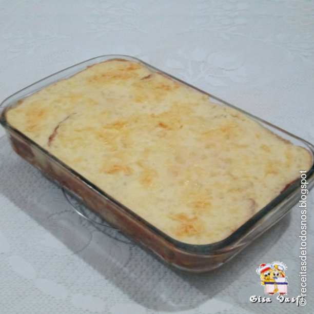 Cubra tudo com a mistura de purê, polvilhe parmesão ralado e leve ao forno convencional, por 35', ou ao micro, por 10'.