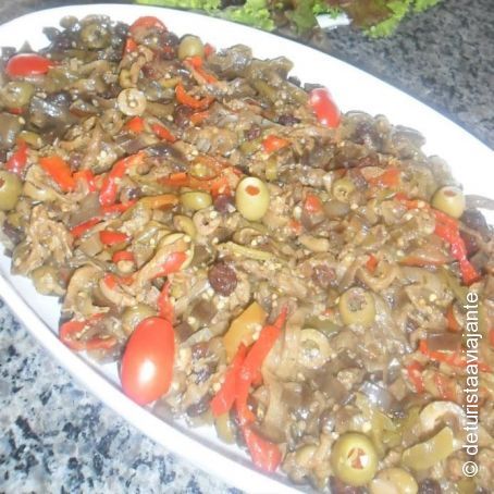 Pique os pimentões bem miúdos, misture com a uva passa e a berinjela e tempere como salada, acrescentando o vinagre o azeite e o sal. Deixe um bom caldo. Esparrame a mistura em uma assadeira untada, tampe com papel alumínio e leve ao forno médio, mexendo a cada 10 minutos. Se o caldo secar, acrescente a mistura de vinagre e azeite.