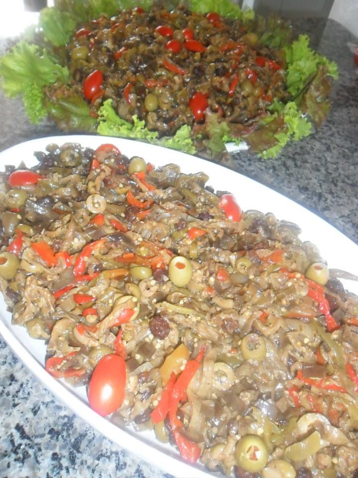 Depois de 30 minutos, retire e acrescente as azeitonas e a cebola. Mexa bem e volte ao forno por mais 10 minutos para a cebola murchar e a berinjela terminar o cozimento. Sirva frio com torradas.