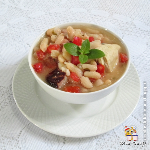 Refogue o bacon na manteiga, acrescente as duas peças de frango, a linguiça, a costelinha, o colorau, o caldo de frango, o vinho, o cheiro-verde, o coentro e o feijão e leve para cozinhar.