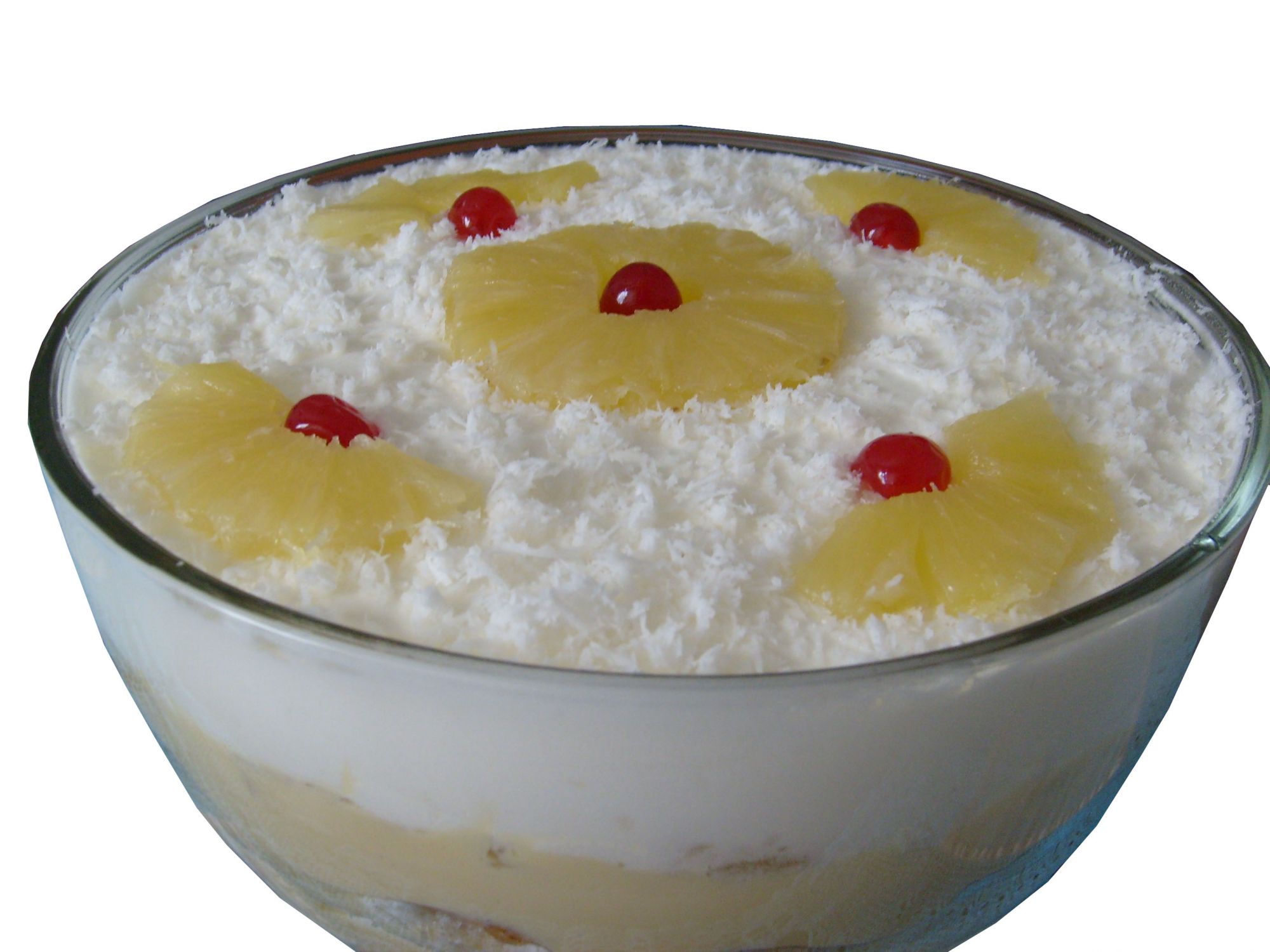 Em uma travessa grande coloque o creme de abacaxi depois disso coloque a cobertura e salpique o coco ralado por cima.E leve a geladeira por três horas.